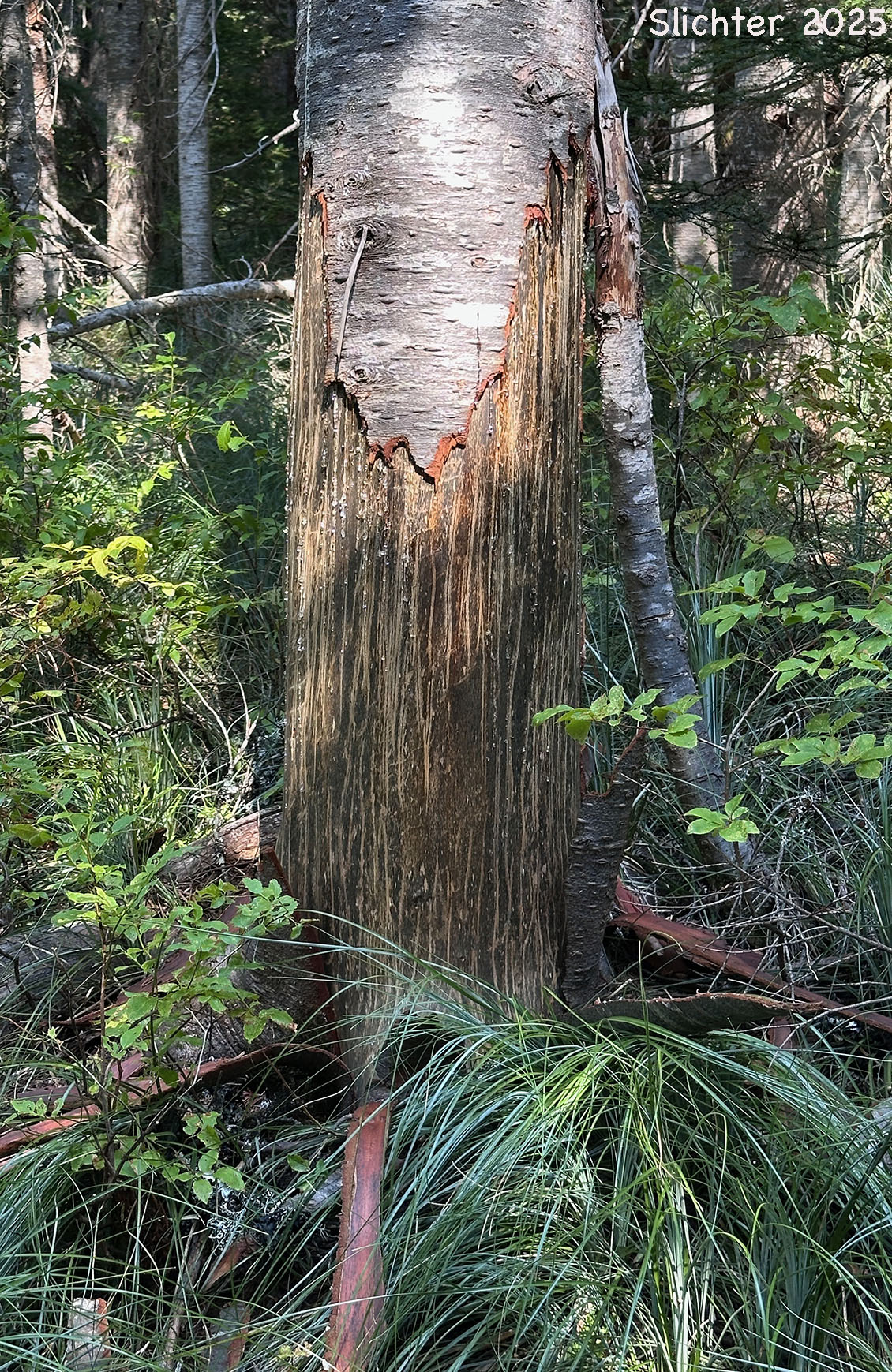 More black bear scat in the image at left, this time observed along the old Cascade Crest Trail between Rock and Blue Lakes, Indian Heaven Wilderness.....September 17, 2025. The image at right shows a tree trunk used as a bear scrape as seen along the Race Track Trail #171 uphill to the south of the Indian Race Track meadows, Indidan Heaven Wilderness.....August 28, 2025.