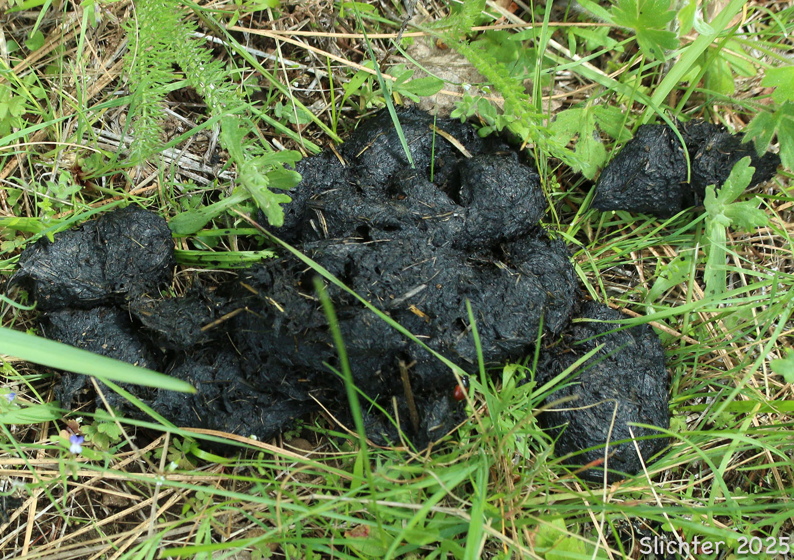 Black bear scat at left on the trail along the Blue Lake Horse Trail #237 at the head of the Blue Lake drainage, Mount St Helens National Volcanic Monument......August 14, 2024. Obviously, it had been eating some huckleberries. The image at right shows bear scat in conifer forest at the Klickitat Oaks Phase 2, a Columbia Land Trust property on the south rim of Snyder Canyon, Klickitat County, WA.........May 6, 2024.