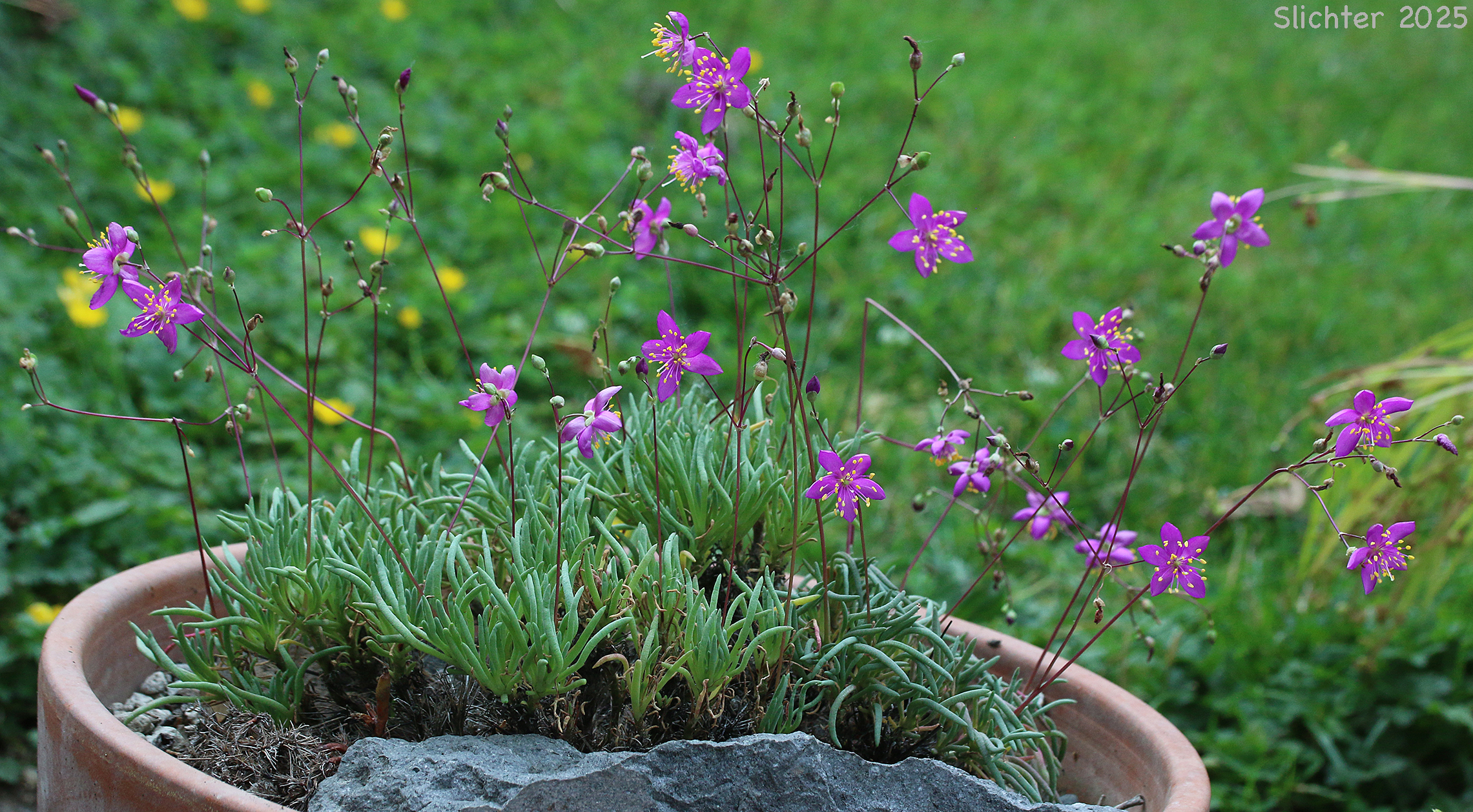 The image above shows a potted spinescent fameflower as seen in the webmaster's garden in Gresham, OR.......June 25, 2025. This plant is over 15 years old and flowers much of the summer when put in full sunshine with occasional watering. During the winter, it is placed under the eaves of the south side of the house for rain protection with watering perhaps once or twice a month to simulate winter rainfall from its east Cascades, arid habitat. Note: The fleshy leaves whither completely so that the plant looks completely dead from late summer through early spring.