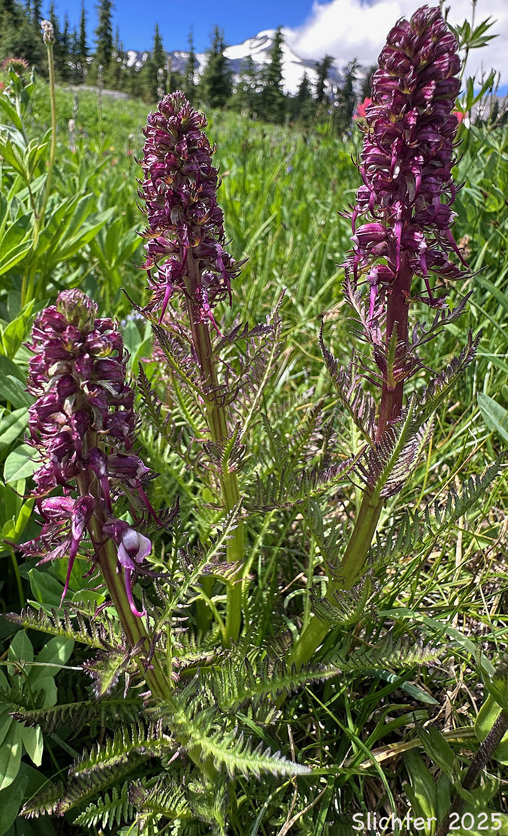 Elephant's head as seen (left and center) from the east side of Mt. Adams.....August 8, 1990. The photo at right shows elephant's head blooming along the south fork Conrad Creek in the Goat Rocks Wilderness.........July 21, 2017.