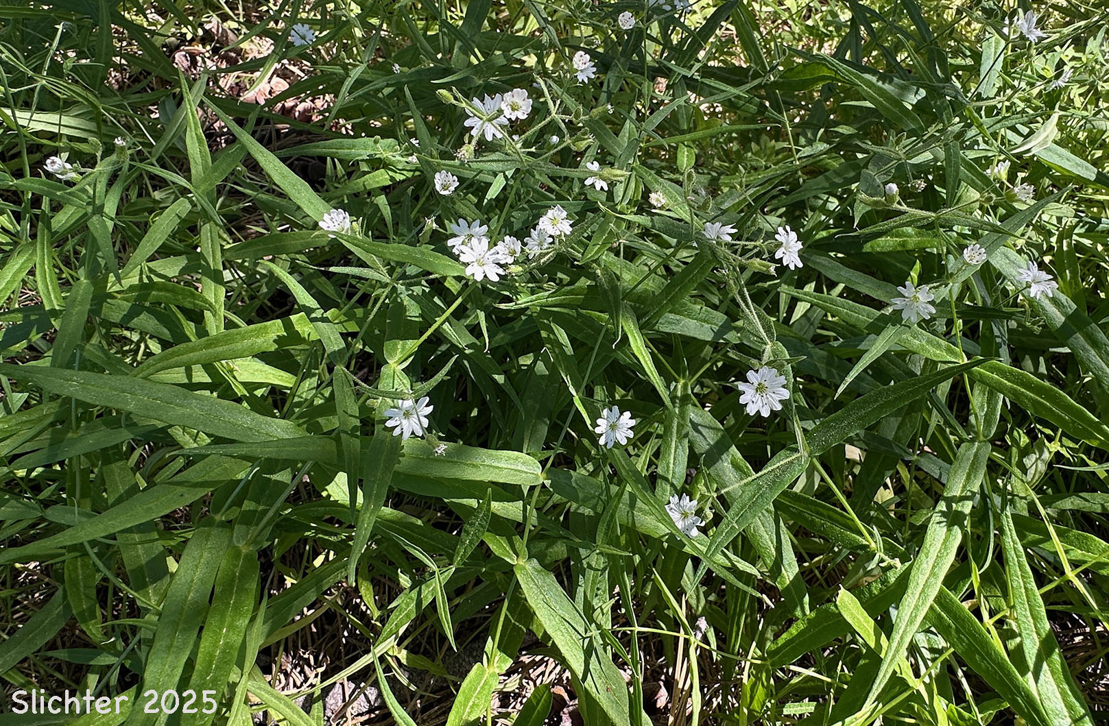 Sticky Chickweed, Sticky Starwort, Tuber Starwort: Pseudostellaria jamesiana (Synonyms: Alsine glutinosa, Alsine jamesiana, Alsine jamesii, Arenaria jamesiana, Stellaria jamesiana)The photo at right shows the upper stem, linear-lanceolate leaves and inflorescence of sticky chickweed. The glandular leaves, stem and pedicels are barely noticeable in the photo. Photographed on the southern portion of Winter Ridge in the Fremont NF...............July 12, 1998.