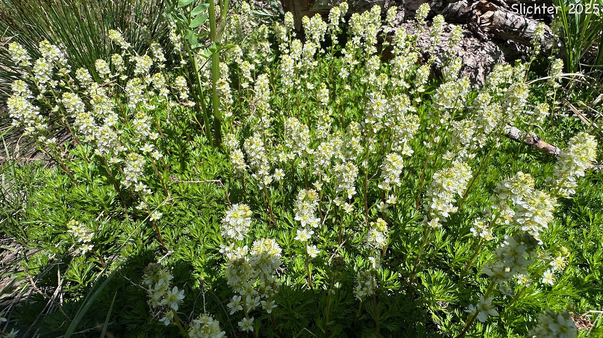 Partridgefoot as seen at left in bloom in moist meadows above a 20' waterfall on the South Fork Conrad Creek, Goat Rocks Wilderness.........July 22, 2016. The photo at right shows partridgefoot in bloom along the Bear Creek Mountain Trail #1130, Goat Rocks Wilderness......July 31, 2019.