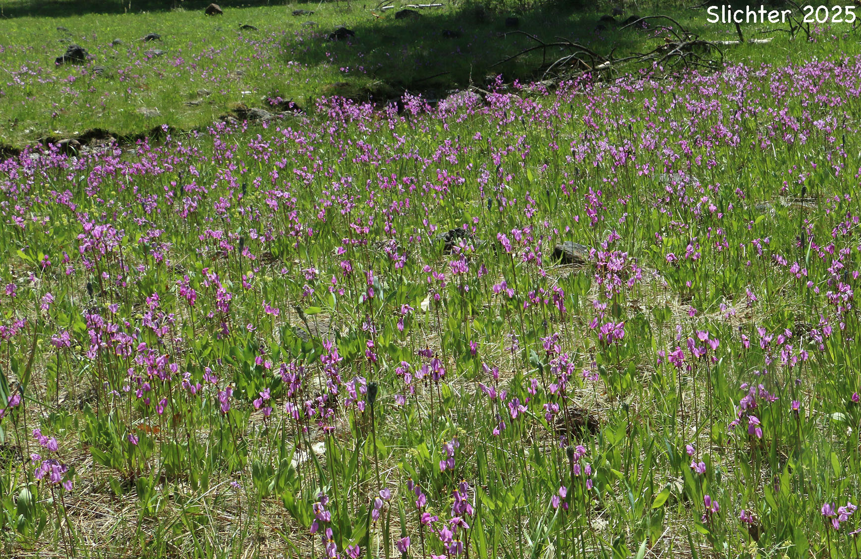 The photo at left shows a close-up of a leaf of poet's shooting star as seen along a stream east of the Mt. Adams Highway on the southeastern slopes of Mt. Adams..........May 13, 2007. Note the small teeth along the upper margin of the blade, a characteristic of this species. The image at right shows a nice habitat view of a nice, dense drift of poet's shootingstars as seen in a vernally moist meadow at the South Breaks, Klickitat Wildlife Area......May 1, 2025.
