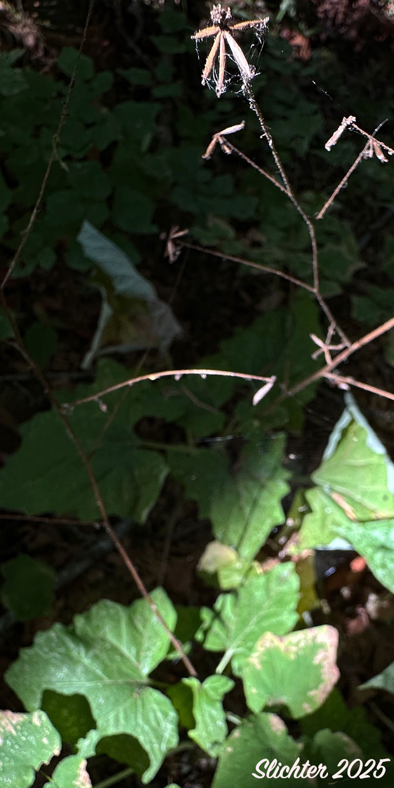 The leaves of pathfinder observed at left along the Falls Creek Falls Trail #152, Gifford Pinchot National Forest.....May 27, 2025. The image at right shows pathfinder with mature fruits atop its long stems as seen along the Dry Creek Trail #194, Gifford Pinchot National Forest....September 27, 2025.