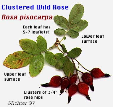 To the right is the rose hip (fruit) of the Clustered Wild Rose. The rose