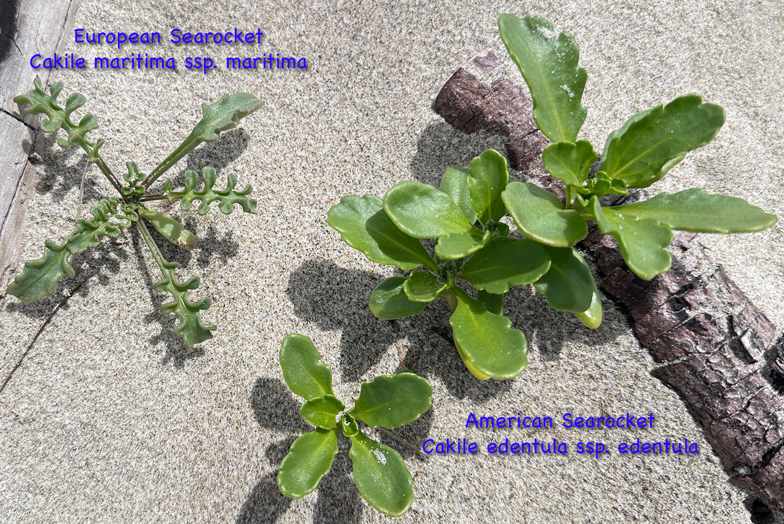 The image at left shows European searocket (Cakile maritima) at left and American searocket (Cakile edentula) at right growing side by side on the beach at Oceanside, Oregon.........August 25, 2012.