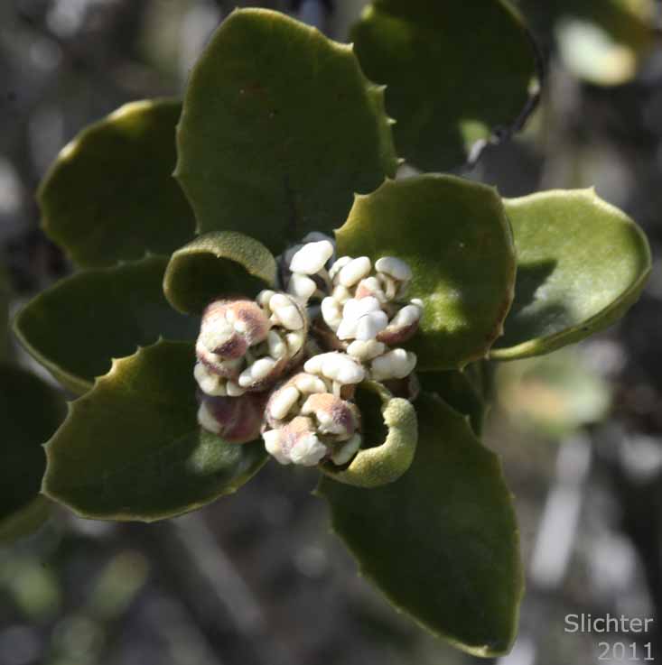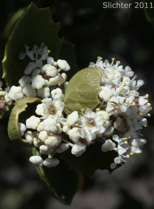 Cup-leaved ceanothus in bloom along San Diego County Route S-22 at the eastern outskirts of Ranchita, California.........March 28, 2011. Note the fleshy, holly-like leaves which are somewhat cupped on the upper surface.