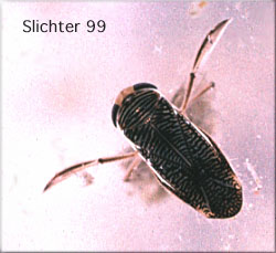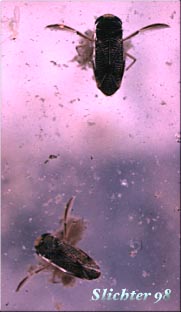 Water boatmen are aquatic insects, swimming jerkily below the water surface. They are similar to Backswimmers, but don't swim on their backs. Water boatmen carry air on their body surface and under their wings, which they trap at the surface. They largely eat algae and other minute vegetable and animal organisms. They can fly, preferring to do so at night, when they leap out of the water, then land on the surface feet down. They then fly away strongly. The young look like adults, and are called nymphs. They go through as many as 5 molts before attaining adulthood. They are common across the United States except in the southeast and Gulf states.