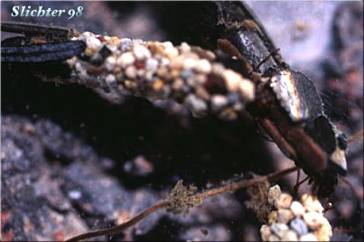 Caddisflies are common insects found near sunny pools and ditches across the United States and Canada. The adults are short-lived and are often found in swarms during the summer months. The adults are about 20 mm long. The larvae are fully aquatic, and they make a protective case to surround their body. Some use sandy debris, while others make the case out of woody debris. Both the adults and young are favorite food of trout.