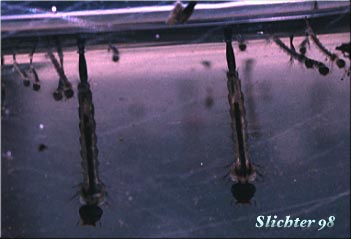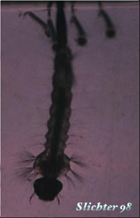Mosquitoes are insects whose larvae live underwater, and whose adult forms live as pests near marshy areas. The larvae feed on plant materials. They breathe air, coming to the surface where they move their abdominal tubes to the surface to respire. Adult females drink the blood of warm-blooded vertebrates, sensing their prey with special heat-seeking antennae. The males are exclusively nectar feeders, and as such are important flower pollenators.