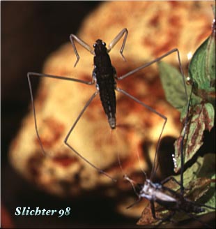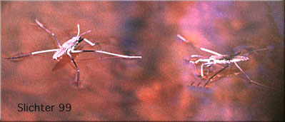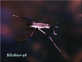 Water striders are common insects of quiet ponds and streams. The body of the Water Strider is long, narrowly elliptical in shape, with a blackish back and silvery white underside. The six legs are long and stilt-like. The long legs of these insects help support them as they skate across the water's surface. Water Striders are predators which prey on small insects, crustacea, or worms which may fall onto the surface of the water.