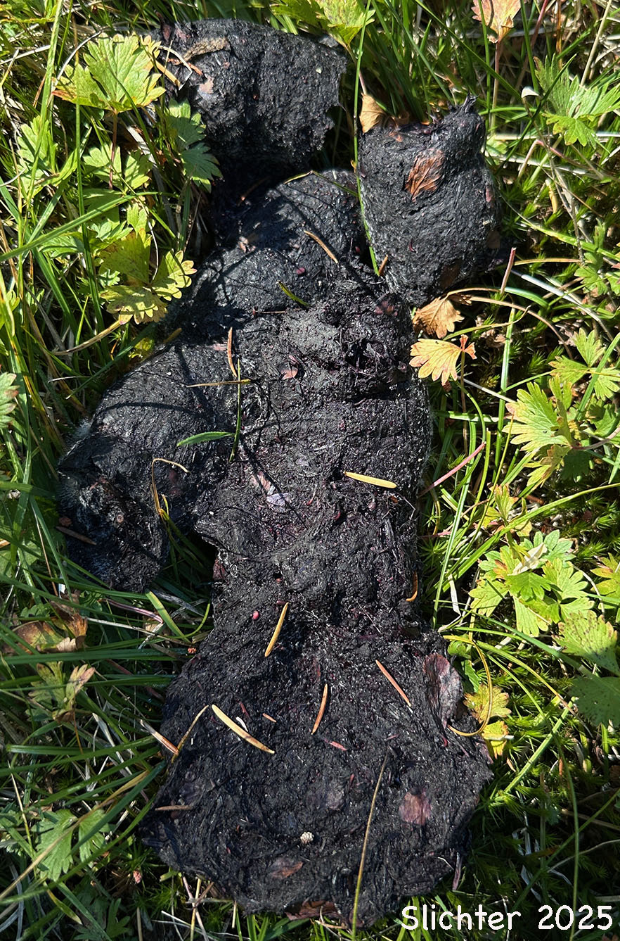 Bear scat seen at left along the Riley Trail #64, Mount Adams Wilderness..........October 3, 2014. The photo at right shows black bear scat as seenalong the Round the Mountain Trail #9 between Crooked and Gotchen Creeks, Yakama Nation lands at Bird Creek Meadows, Mount Adams......September 4, 2022.