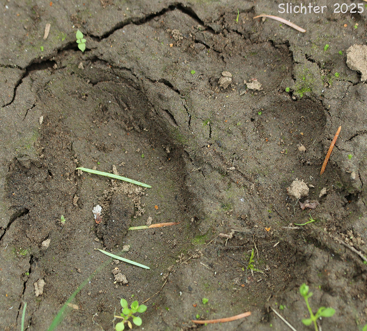 Black bear footprint and scat observed in forest along a vernally moist drainage running uphill to the southwest from Dead Canyon, about 2 miles or so west of the Klickitat River........May 9, 2025.