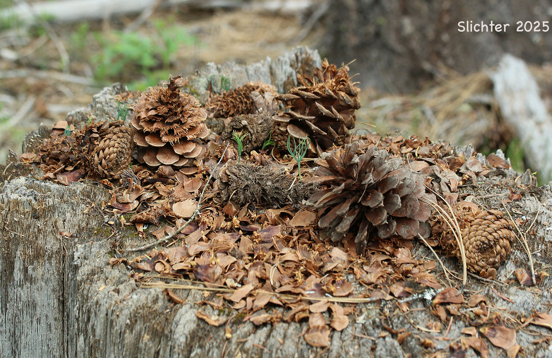 The "dining room table" for a western gray squirrel in forest along a vernally moist drainage southwest of Dead Canyon and about 2 miles or so west of the Klickitat River canyon......May 9, 2025.