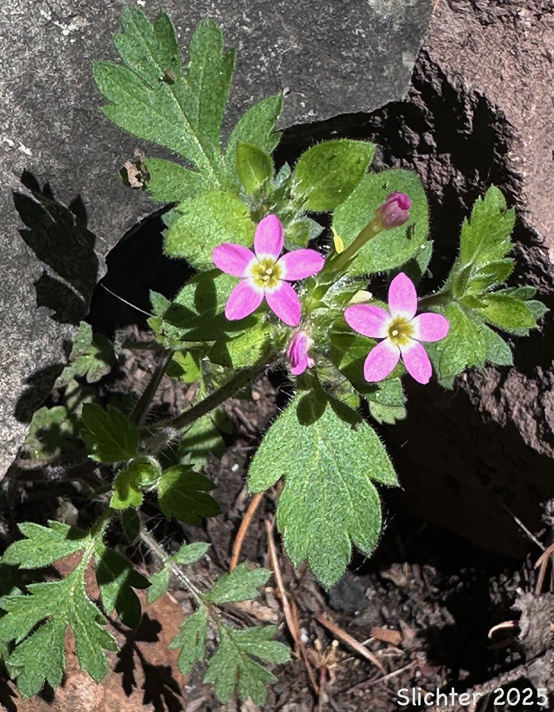 Varied-leaf collomia is an annual with one to several simple to branched stems from the base, rising from 5-40 cm high. The leaves are mainly alternate along the stems. The lower leaves are pinnatifid (compound pinnate) with the blades up to 3.5 cm long and 2 cm wide. The leaves of the middle and upper stems become progressively less cleft, and those found below the flowers are entire or toothed with short petioles.