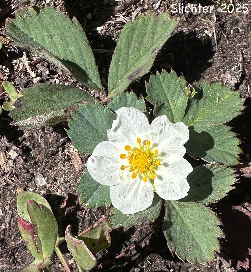 Broad-petal strawberry reblooming at left along the Craggy Peak Trail #3 about one-half mile south of the junction with the Boundary Trail #1, Dark Divide, Gifford Pinchot National Forest.........August 25, 2015. The image at right shows broad-petal strawberry blooming along the Surveyor's Ridge Trail #688 northwest of Gibson Prairie Horse Camp, Mount Hood National Forest.....June 11, 2024.
