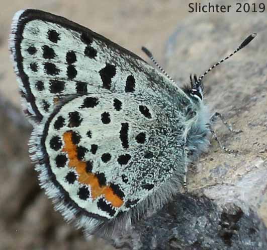 What appears to be a summit blue sunning on rocks atop the summit of Lookout Mountain, Badger Creek Wilderness. It's host plant is the sulphur-fower buckwheat (Eriogonum umbellatum), of which variety hausknechtii is abundant in the area. The underwing markings suggest this could be a Cascadia blue, but it's host plant, parsnipflower buckwheat (Eriogonum heracleoides) is not found at this site, and would be more numerous in the foothills and plains east of the Cascades, about 10-15 miles further east.