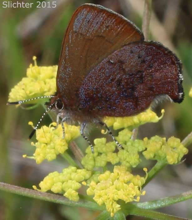 A brown elfin nectaring on a desert parsley (probably Lomatium triternatum) along the School Canyon Trail #468 at a burned area about one half of the way between the trailhead and Ball Point, Badger Creek Wilderness.........May 10, 2015.