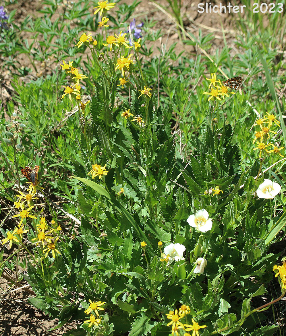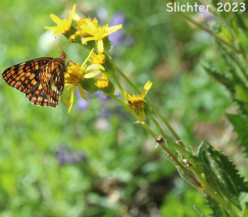 Hoffman's checkerspots observed nectaring upon falsegold groundsel (Packera pseudaurea var. pseudaurea) atop Scott Mountain, Mount Washington Wilderness......July 18, 2023.