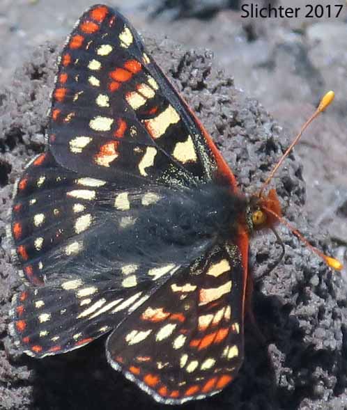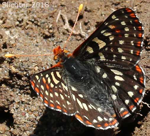 A snowberry checkerspot as seen getting ready to do some 'mudding' at a wet spot along the Loowit Trail about 50 meters west of the junction with the Butte Camp Trail, Mt. St. Helens National Volcanic Monument......July 23, 2017.