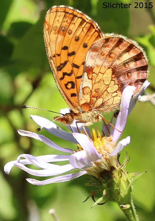 What appears to be a western meadow fritillary nectaring on a cascade aster in Dark Meadows, Dark Divide, northern Gifford Pinchot National Forest...........July 3, 2015.