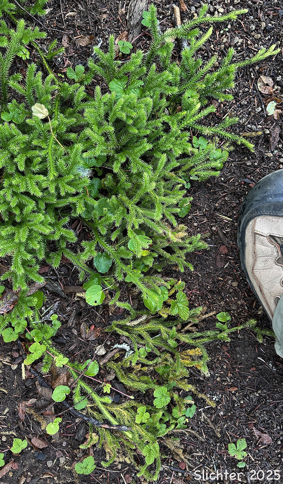 Common clubmoss as seen at left along the Boundary Trail #1 east of Dark Meadows, Dark Divide, Gifford Pinchot National Forest..........July 3, 2015. The image at right shows common clubmoss encroaching across the Sawtooth Mountain Trail #107 near the Sawtooth Mountain summit, Indian Heaven Wilderness......September 15, 2025. The men's size 13