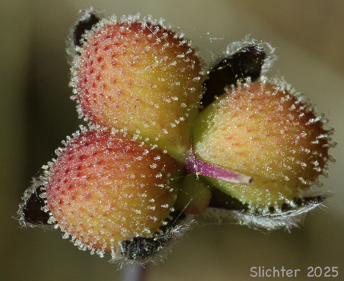 The photo at left shows a close-up of the inflorescence of great hound's tongue as seen at Catherine Creek, Columbia Gorge Scenic Area.........April 14, 2007. The image at right shows the developing fruits of great hound's tongue as seen at the South Breaks, Klickitat Wildlife Area......May 5, 2025.