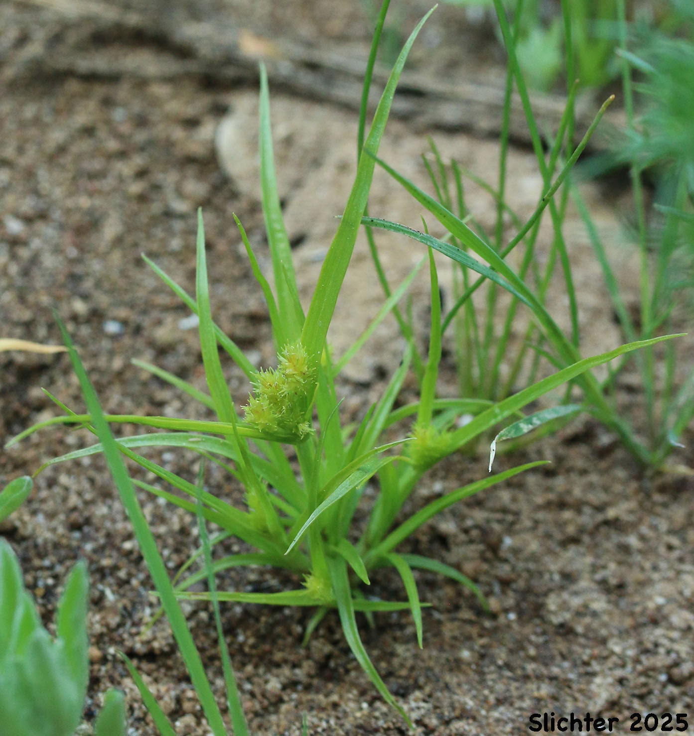 Awned Flatsedge, Bearded Flatsedge: Cyperus squarrosus (Synonyms: Chlorocyperus inflexus, Cyperus aristatus, Cyperus aristatus var. runyonii, Cyperus inflexus, Dichostylis aristata, Mariscus squarrosus) -