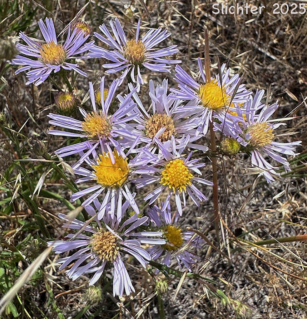 The inflorescence is a corymb or cymose panicle of one to many flower heads about 2.5 cm wide. The involucre is 5-7 mm high with obtuse to acutely tipped bracts. The bracts are green and occasional purple margined. Individual bracts are narrowly linear or linear-oblong with short hairs along the margins. The 20-50 rays are about 6-15 mm long and blue, violet or purple in color.