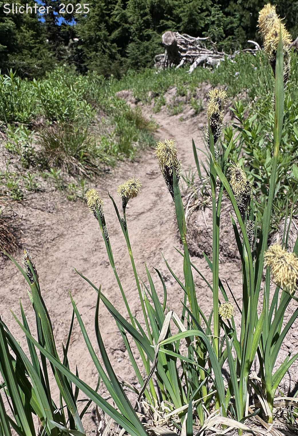 the climber's trail in moist meadows on Mt. Adams about one-quarter mile southeast of the southern lateral moraine to Mazama Glacier.........July 19, 2009. The photo at right shows the inflorescence of showy sedge as observed in High Prairie, Badger Creek Wilderness.....June 29, 2023.
