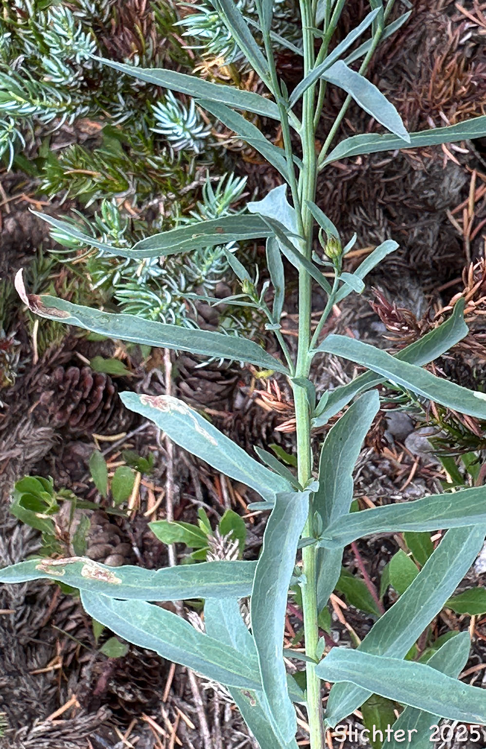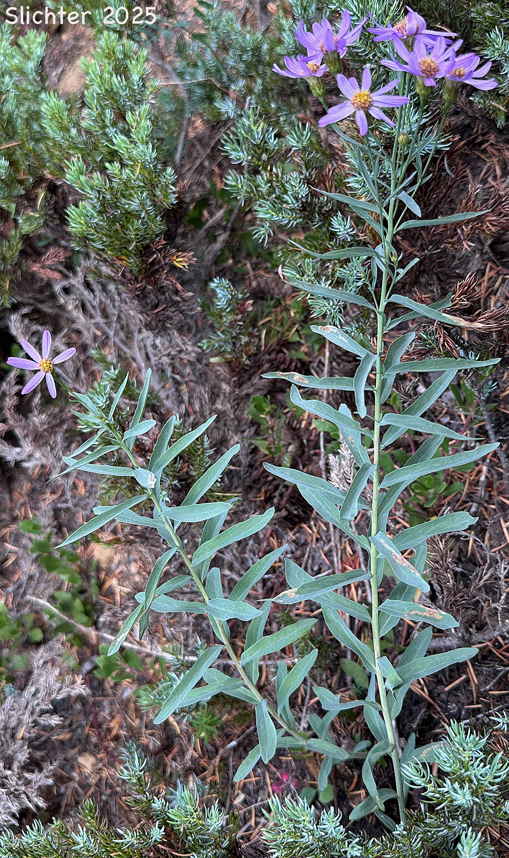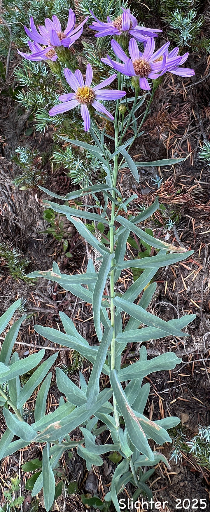 Klickitat aster is a pretty aster with erect, often solitary stems arising from 40-150 cm high. The stems and leaves lack hairs or glands and tend to be a glaucous blue-green color. The lowest leaves are very reduced in size while the leaves of mid- to upper stem are either linear in shape and sessile or narrowly lance-elliptic in shape with very short petioles. They range from 3.5-9 cm long and 4-15 mm wide with mostly entire margins. The leaves tend to be 5-12 times longer than wide.