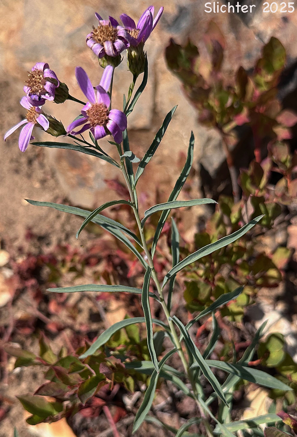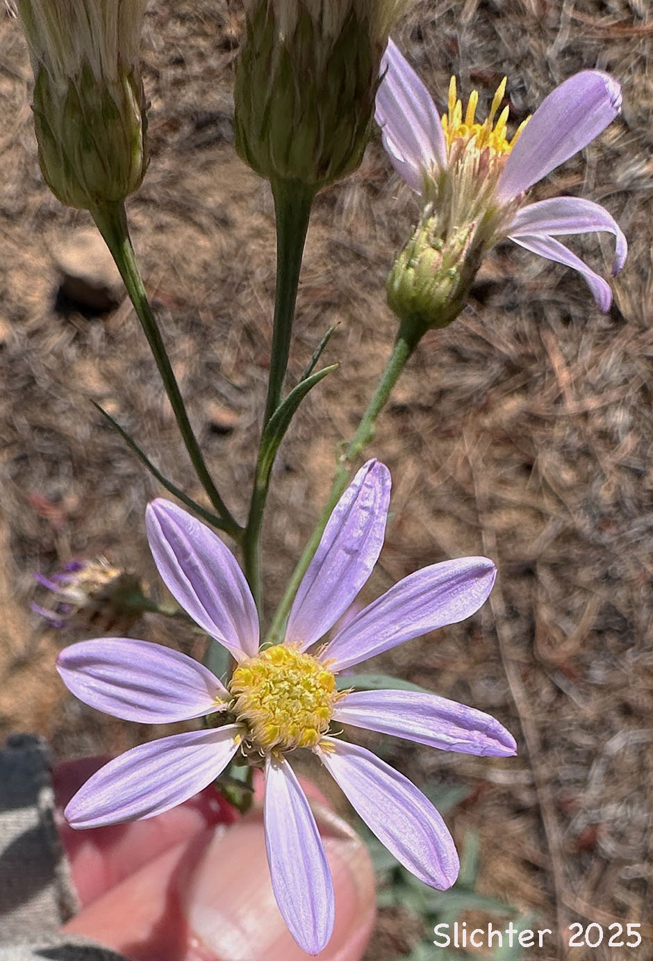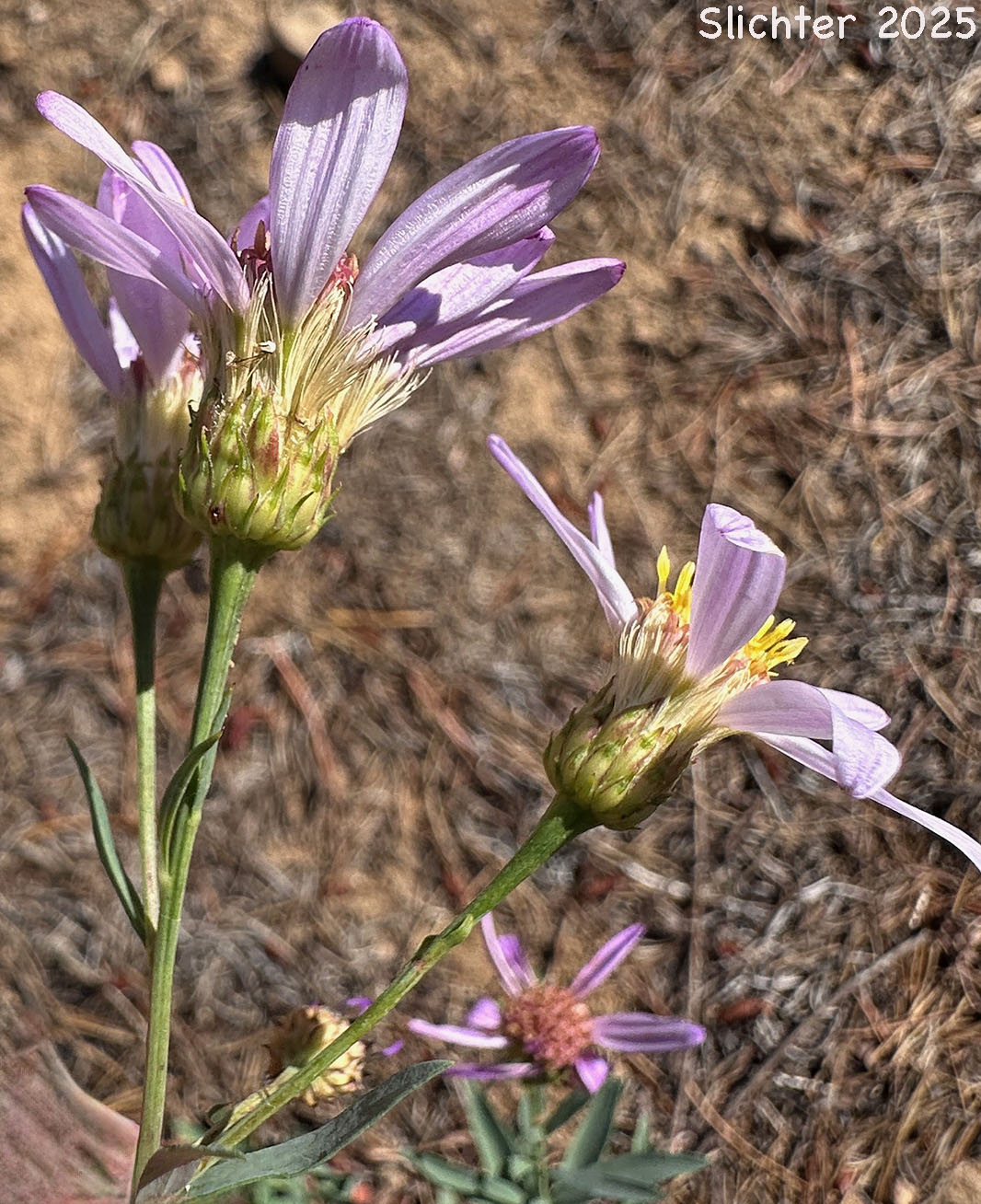 The flower heads are several to many with the individual involucres 7-9 mm high. The bracts are narrow, pointed and have a strong midvein which is somewhat keeled. The bracts are greenish at the tips or the margins have a narrow band of purplish coloration. The 8-13 rays are 12-20 mm long and a light purple color.