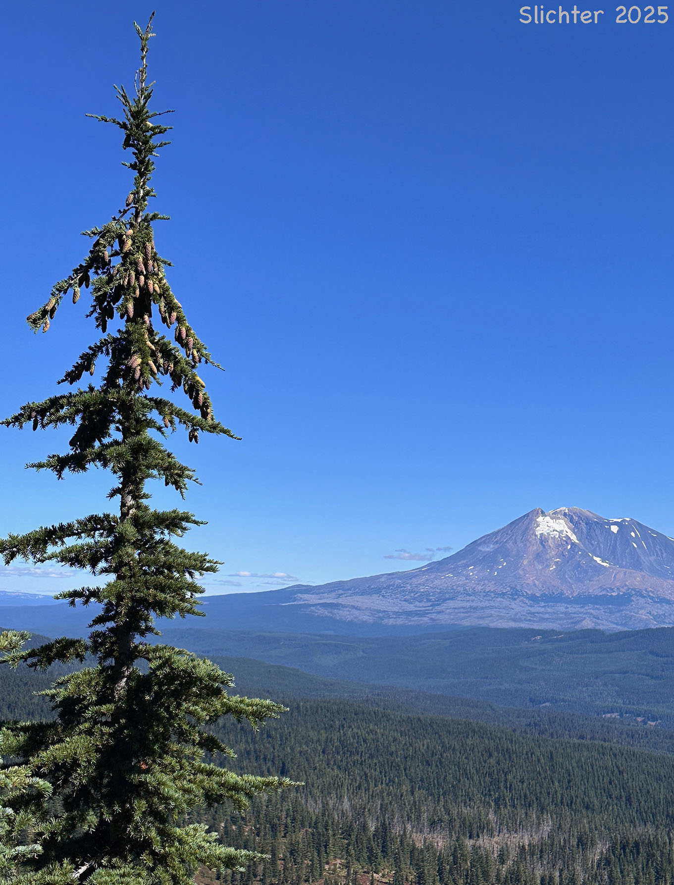 Mountain hemlock as seen (at left and center) along the Pacific Crest Trail near Timberline Lodge, Mt. Hood, OR.........October 19, 2010. Note the drooping top to several of the trees. The image at right shows mountain hemlock (with Mount Adams in the distance behind it) along the Sawtooth Trail #107 downhill to the north of the Sawtooth Mountain summit, Indian Heaven Wilderness......September 15, 2025.