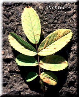 2. Leaves with 5-7 pinnately compound leaflets. The leaves are about 1.5 to 4 cm long. The leaflets are ovate and with toothed margins.