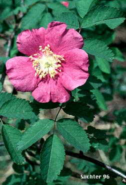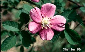 To the left, a rose hip, fruit of the Nootka Rose. To the right, Little Wild Rose, Rosa gymnocarpa.