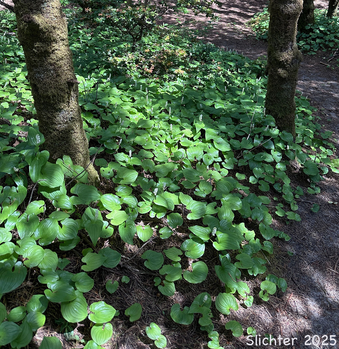 False Lily-of-the-valley at left at Larch Mountain, Mt. Hood National Forest, mid June, 1988. The photo at right shows false lily-of-the-valley in bloom in the webmaster's garden in Gresham, OR.......May 9, 2018.