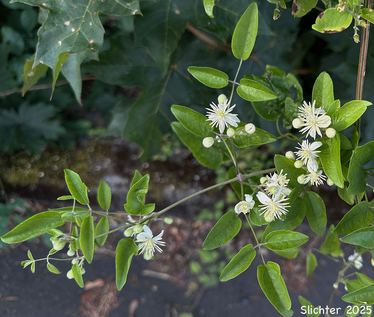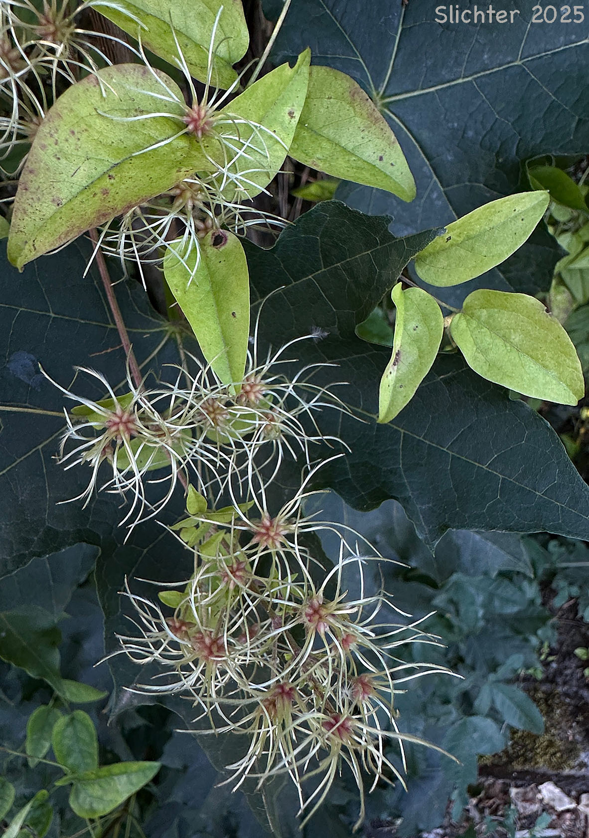 Traveler's joy spotted flowers and then with ripening fruits along a city street in north-central Gresham, OR.....July 27, 2005 (at left) and August 23, 202 (at right)5. Note the entire margins on the leaflets.