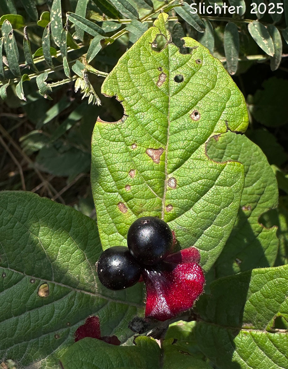 Close-up photos of the paired black fruits of twinberry honeysuckle as seen along the Springwater Trail about one mile east of Gresham, OR..........September 6, 2010.