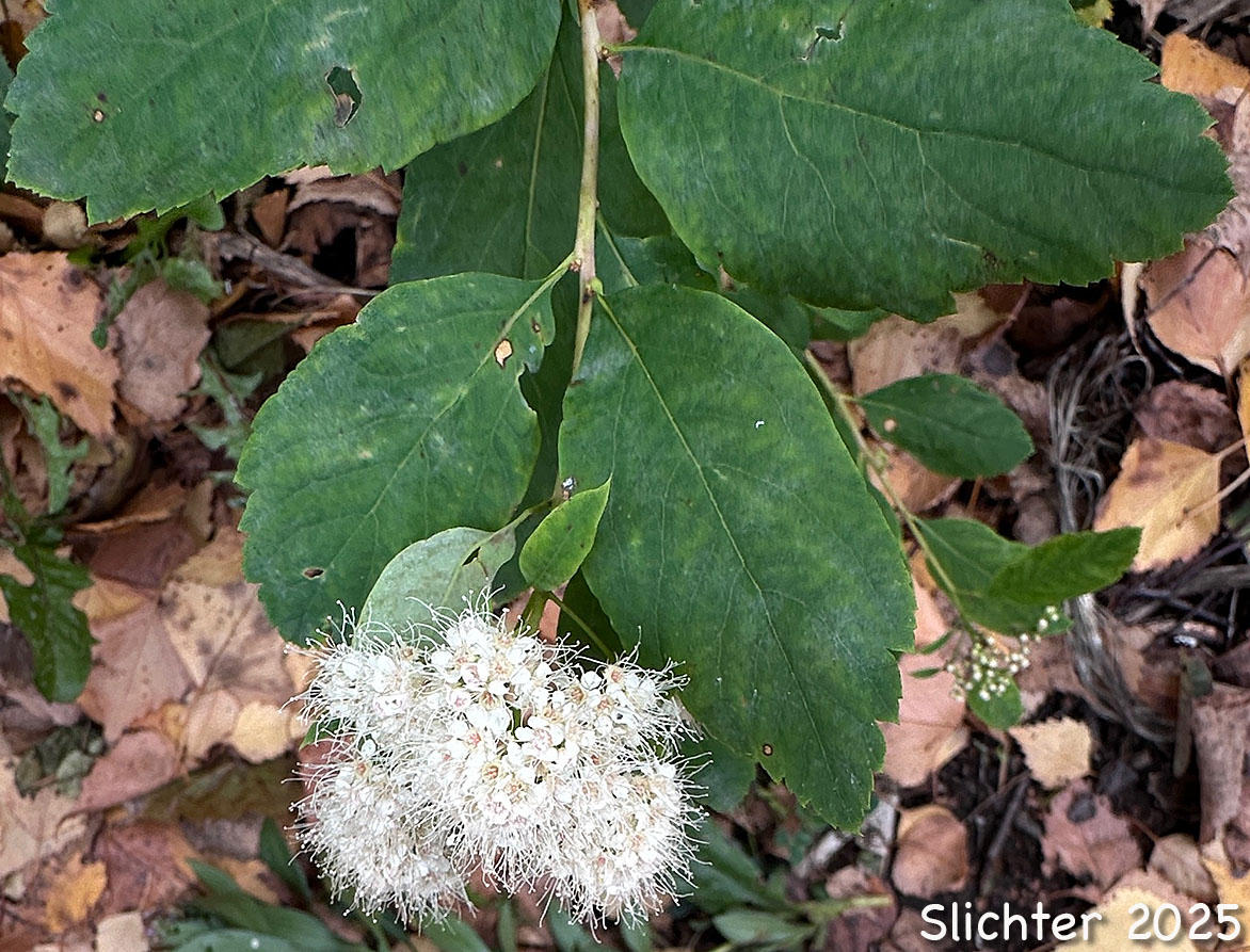 The image at left shows a close-up view of the inflorescence of shinyleaf spiraea as seen in the webmaster's Gresham, OR garden.......June 4, 2020. The image at right shows a very late-blooming shinyleaf spiraea in the webmaster's garden in Gresham, OR......October 22, 2025.