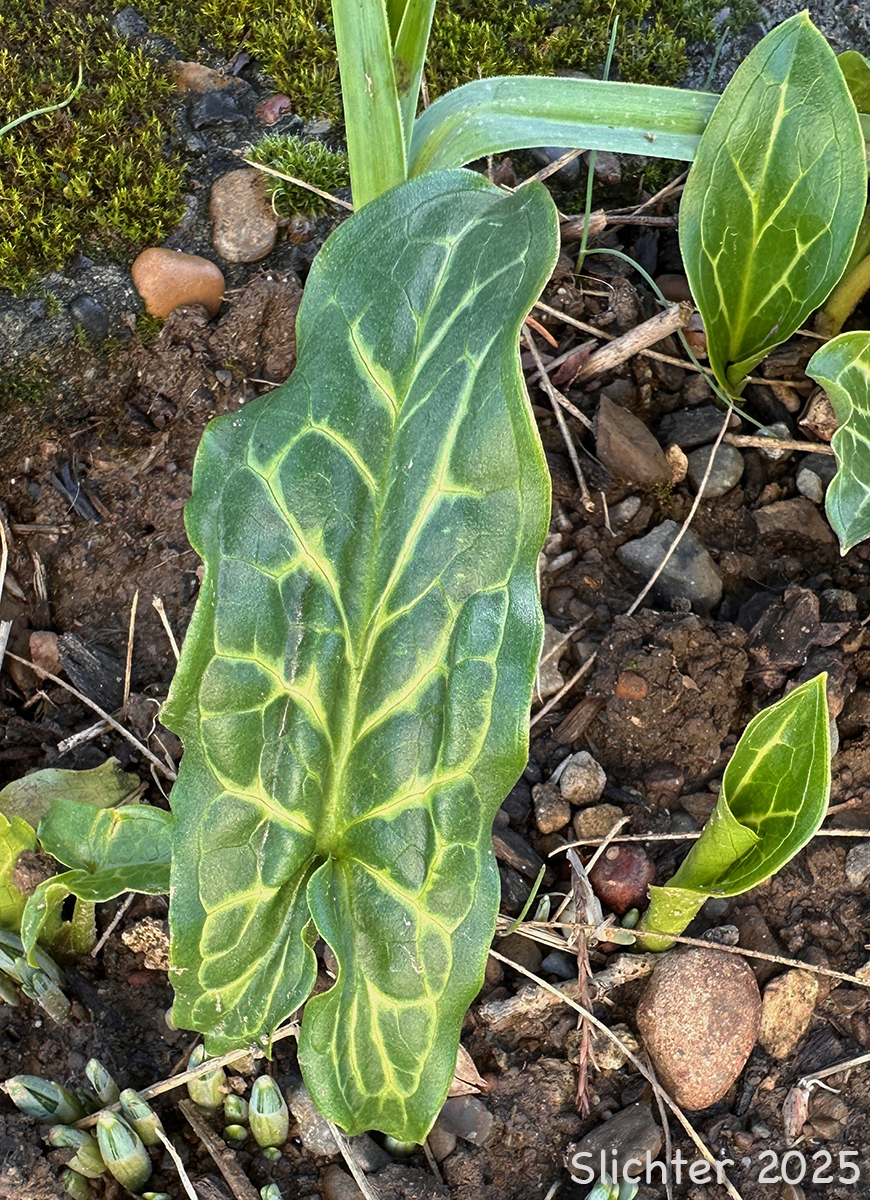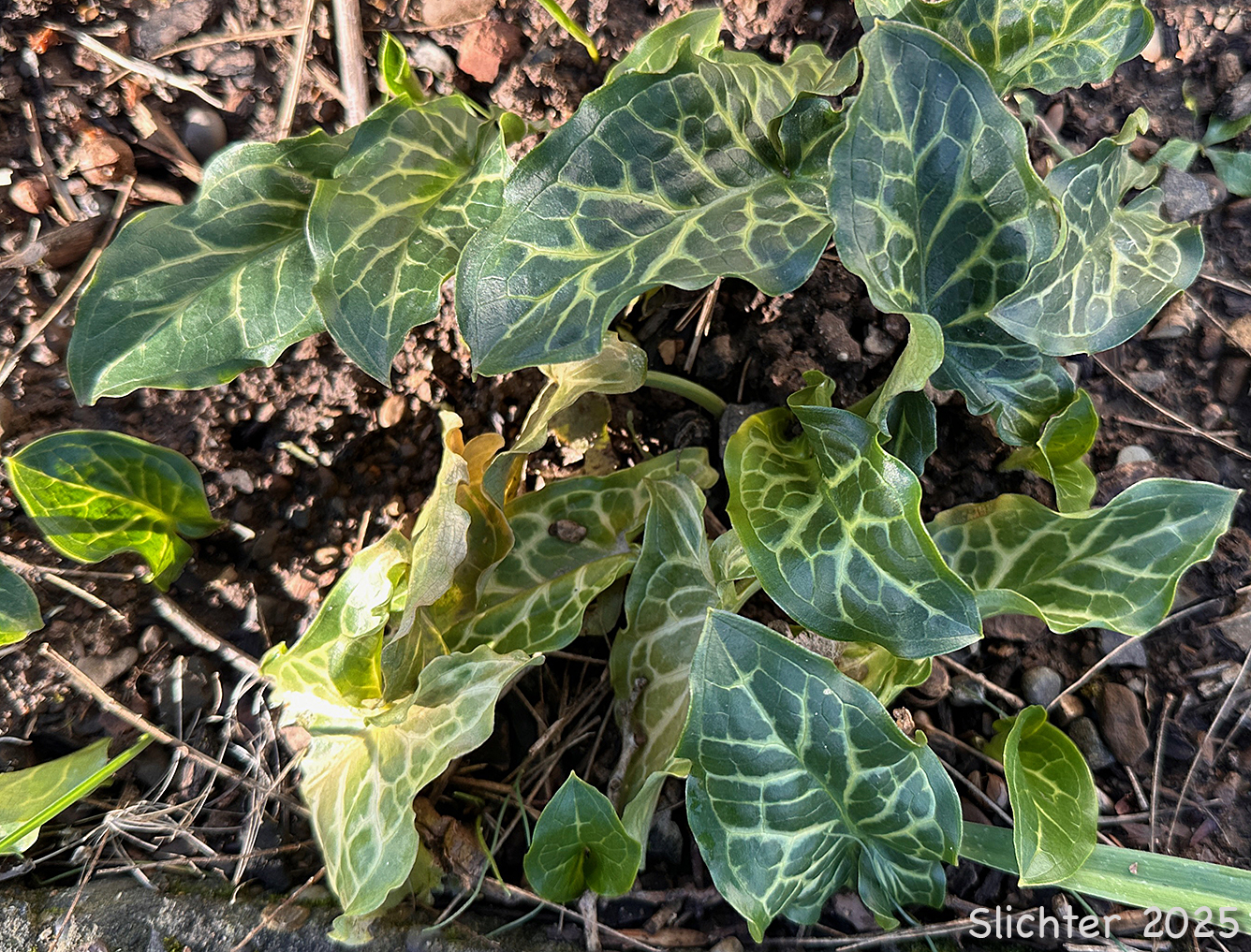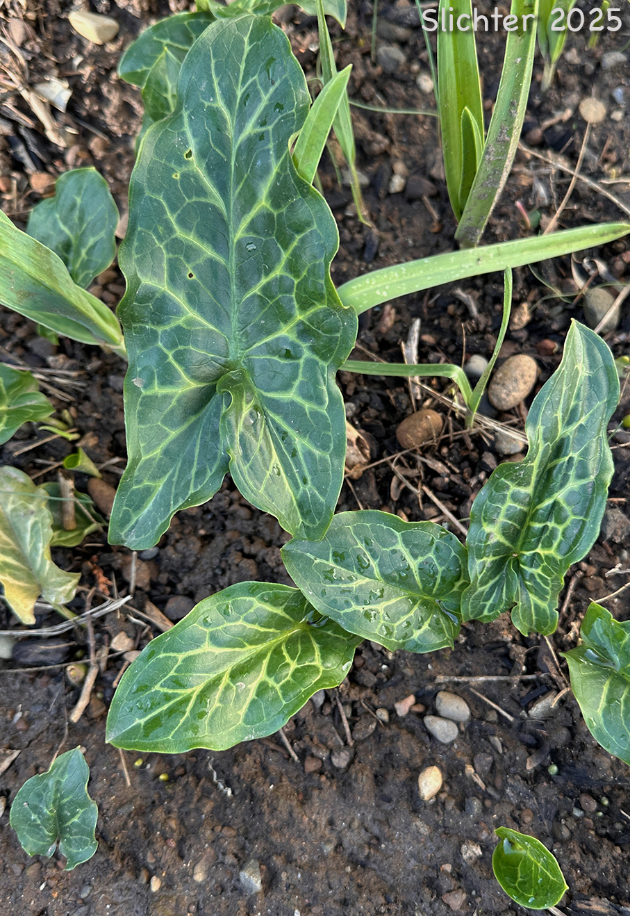 Italian arum is a highly invasive weed. Here it is seen in a neighborhood garden in Gresham, OR.....December 28, 2025.