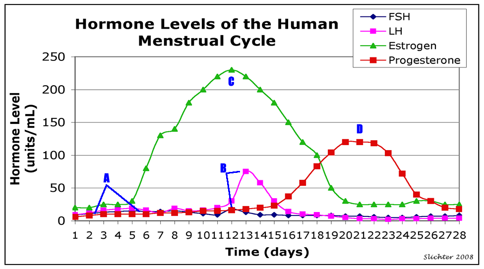 16. What event of the menstrual cycle is occuring due to a rise in FSH at A in the graph below?