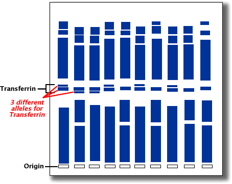There are 3 different alleles present for the protein transferrin. Note the 3 different levels the fragments occupy as noted in the diagram below.