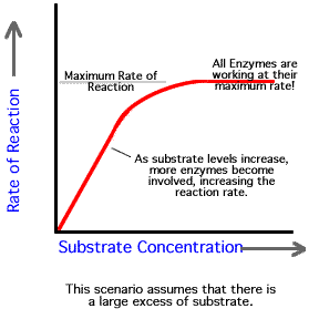 A) As the substrate concentration increases, the enzymes move faster so there is a greater chance a reaction will occur.