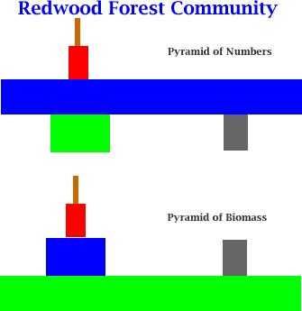 In the redwood forest community, explain how it is possible for the number of producers can be less than the number of herbivores, yet the biomass of the producers is so much greater.