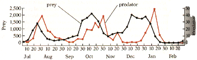 15. The graph below illustrates the relationship between predator and prey populations. Predict what will happen to the predator population when the prey population increases in number.